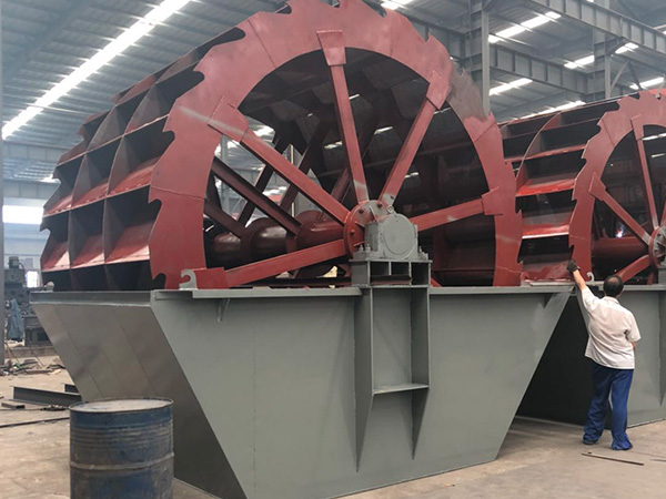 轮斗洗砂机在工作时,通过电机三角带、减速机、齿轮减速后带动叶轮缓慢转动,砂石有给料槽进入洗槽中,在叶轮的带动下翻滚,并互相研磨,除去覆盖砂石表面的杂质,同时破坏包覆砂粒的水汽层,以利于脱水;同时加水,形成强大水流,及时将杂质及比重小的异物带走,并从溢出口洗槽排出,完成清洗作用。干净的砂石由叶片带走, 从旋转的叶轮倒入出料槽,完成砂石的清洗作用。
